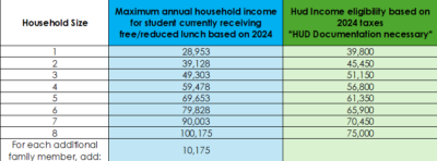 - Meet Free and Reduced Lunch program / USDA Eligibility (chart below) based on 2024 Taxes with student listed as dependent.