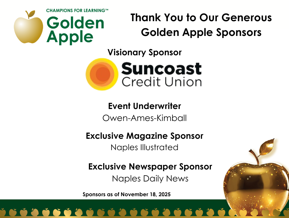 The Golden Apple Celebration of Teachers showcases our Collier County educators’ best practices that excite students about learning and increase student achievement. During this community-wide event, Golden Apple recipients, Teachers of Distinction, and the Collier County Public Schools Teachers of the Year are honored for the tremendous impact they are making for our students and the teaching profession.