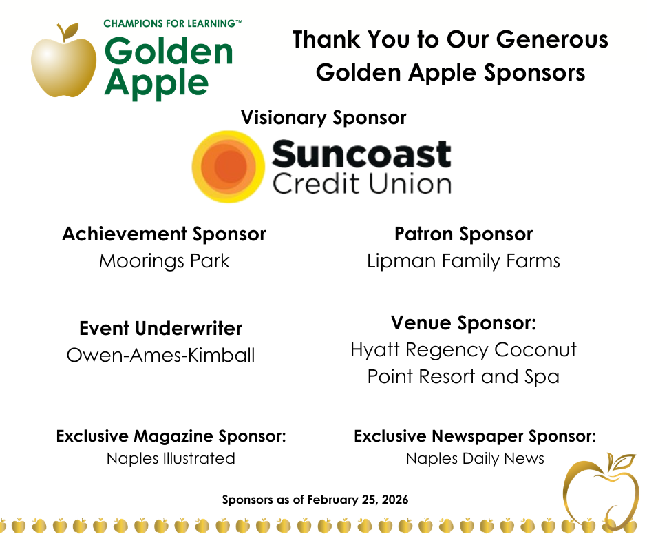 Since 1990, the Golden Apple Program has shined a light on the excellence of Collier County educators. As Collier County’s premier educator recognition program, Golden Apple unites the community in honoring, thanking, and celebrating a select cohort of teachers who inspire their students and exemplify the very best of the teaching profession. The process culminates with the Golden Apple Celebration of Teachers Dinner, a first-class community event that shines a spotlight on educators. During an elegant, sit-down dinner, we will formally recognize the 2025-2026 Teachers of Distinction, Collier County Teachers of the Year, and Golden Apple recipients. This evening is about gratitude, recognition, and pride in those whose dedication and excellence elevate the entire teaching profession.